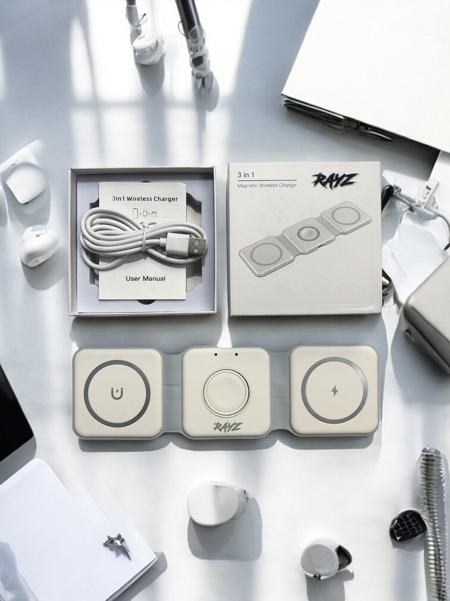 The RAYZ 3-in-1 Magnetic Wireless Charger is a compact and versatile charging solution designed to power your essential devices simultaneously. Perfect for home, office, or travel, this sleek charging pad features a foldable design for ultimate portability.